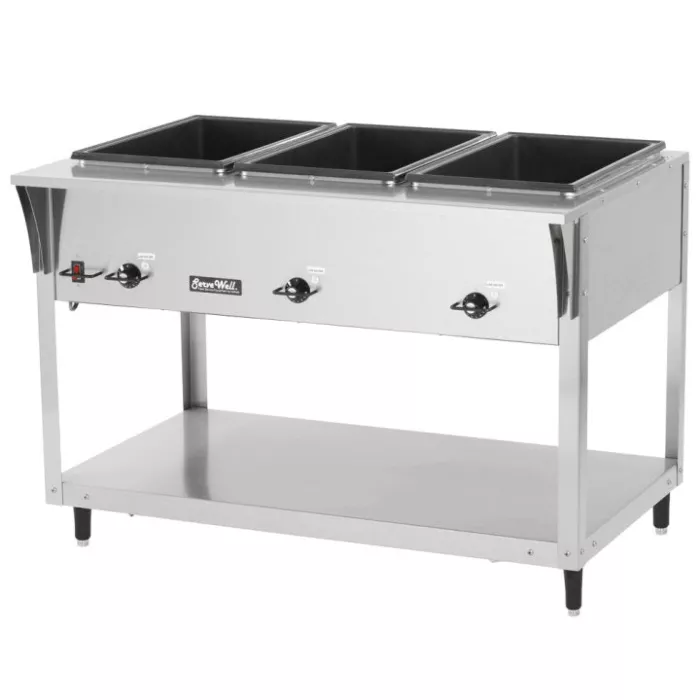 Featuring a design that?s even sleeker than the original, the Servewell SL streamlined hot-food table by Vollrath is more powerful, efficient and innovative than ever. The table and legs are made of strong stainless steel, while the wells are constructed of self-insulating thermoset fiber-reinforced resin to offer maximum energy efficiency. The dome heating elements use up to 25 percent less energy by concentrating that energy in the wells, while the capillary thermostat supplies power only when it?s needed to reduce operational costs. Thermostatic controls ensure accurate heating and adjust automatically for water temperature and food volume changes to reduce food waste. A low-water indicator light keeps you informed, and the wide no-drip lips on the wells keep the surface dry. The streamlined design is exceptionally sleek and saves valuable space without compromising quality.