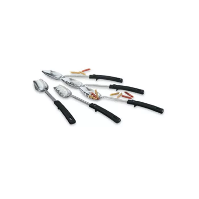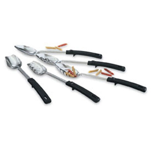 Stainless steel. Thumb notch for comfortable use and to prevent spoon from sliding into pan. Handles heat resistant to 230°F (110°C).