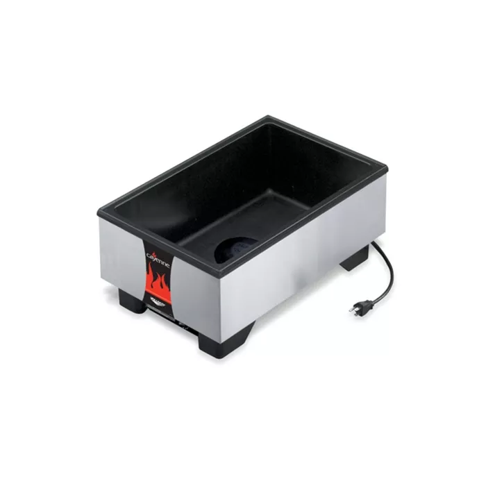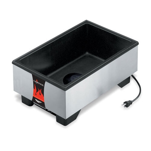 Thermoset Fiber-Reinforced Resin Wall is self insulating and maximizes energy efficiency. Capillary tube thermostat control supplies power only when needed for maximum power efficiency. Low-water indicator light eliminates guesswork. Dome heating element uses up to 25% less energy and concentrates energy into the well. Element's non-stick surface prevents scale build-up for easy cleaning and longer operating life. Element is cast-in for longer service life and greater energy transfer. Must be used with water for maximum energy transfer. Standard black well and brushed exterior. Wide no-drip lip keeps countertop dry. Recommend using up to 4" (10.2 cm) deep food pans - standard and fractional sizes. Model features Direct Contact Heating System. Dimensions: 21 3/4" x 13 3/4" x 9".