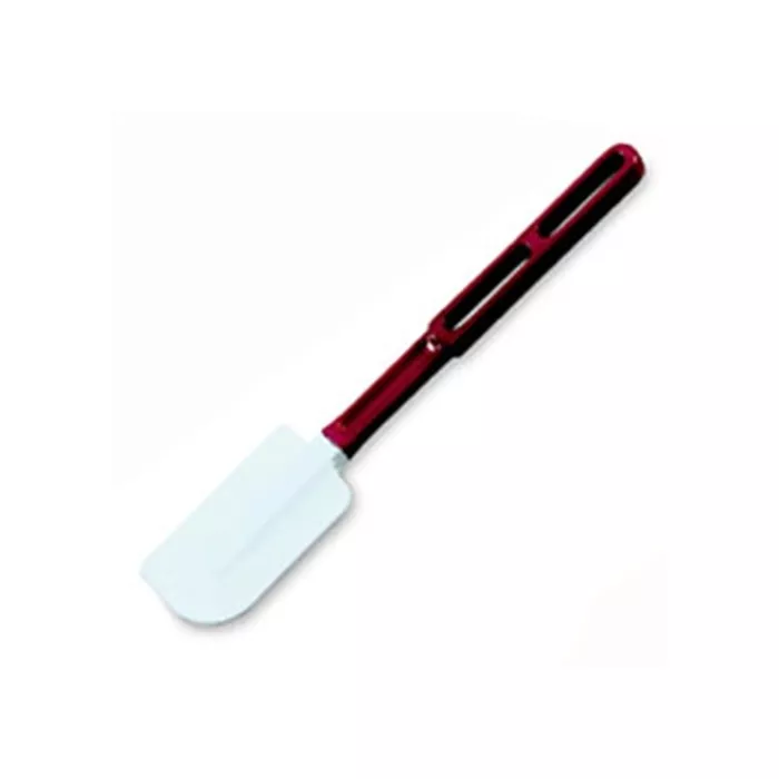 Unique contoured handle offers comfortable grip and hangs conveniently. Nylon handle and silicone blade heat resistant to 500° F (260° C), molded together to form sanitary seal - eliminating food traps. Non-scratching silicone rubber spoon/blade is stain and odor resistant. Molded silicone rubber numbs keep blade off counter. Ideal for use with non-stick cookware, dishwasher safe.