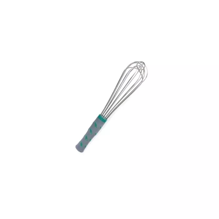 Patent-pending ergonomic whip with thicker wires for mixing heavy food products. One-piece handle is completely sealed - no crevices to collect food or bacteria. Center reinforcement wire eliminates bending, twisting and deforming. Nylon handle is heat resistant to 475°F (246°C). Comfort nubs on handle for sure grip. Wires are stainless steel to resist corrosion and rusting. Knob end on handle to prevent slippage while in use. Color coded aqua for French style for easy identification. Limited lifetime warranty. NSF Certified.