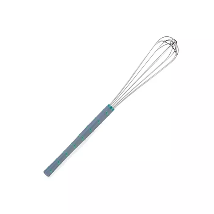 Patent-pending ergonomic whip with thicker wires for mixing heavy food products. One-piece handle is completely sealed - no crevices to collect food or bacteria. Center reinforcement wire eliminates bending, twisting and deforming. Nylon handle is heat resistant to 475°F (246°C). Comfort nubs on handle for sure grip. Wires are stainless steel to resist corrosion and rusting. Knob end on handle to prevent slippage while in use. Color coded aqua for French style for easy identification. Limited lifetime warranty. NSF Certified.