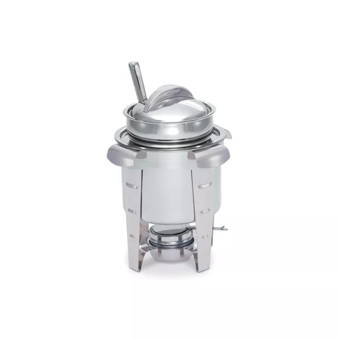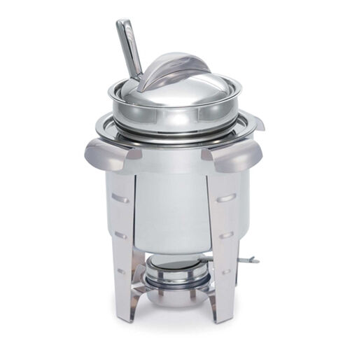 Mirror finished stainless steel – durable and easy to clean. Patented contemporary styling. Rectangular chafer features cover holder and Vollrath® Super Pan V™ food pan. Each packed in full-color merchandising carton.