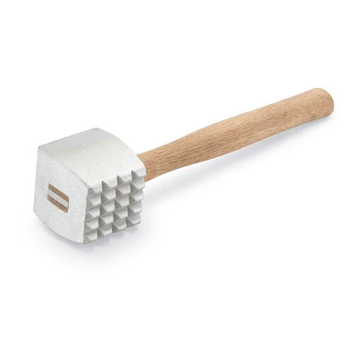 Meat Tenderizer, 13 1/4'' long, cast aluminum, hickory handle, one side coarse prongs, other side fine prongs, Imported
