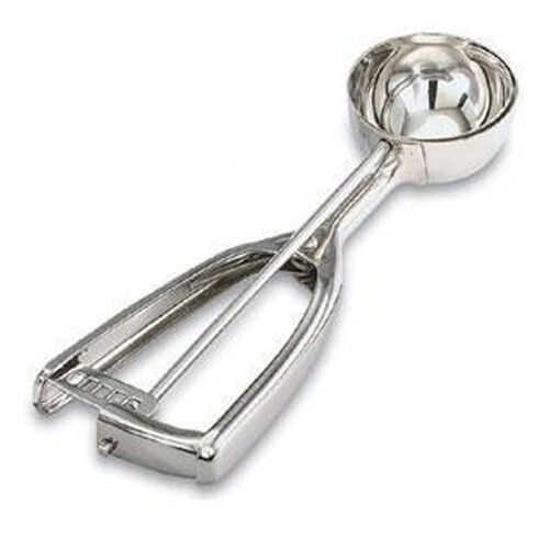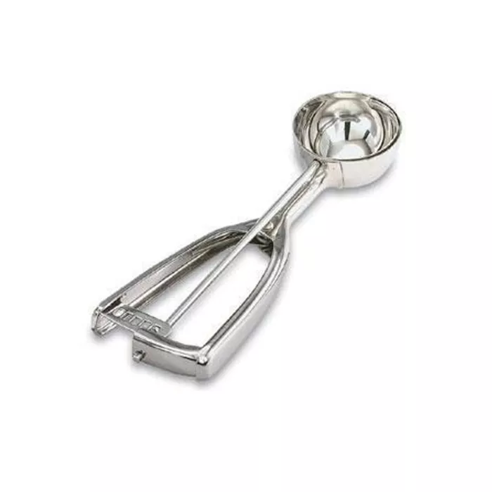 Round squeeze disher. Durable construction, convenient and ergonomic design. Constructed entirely of stainless steel. Blade extends beyond bowl to prevent sticking. For use with either left or right hand.