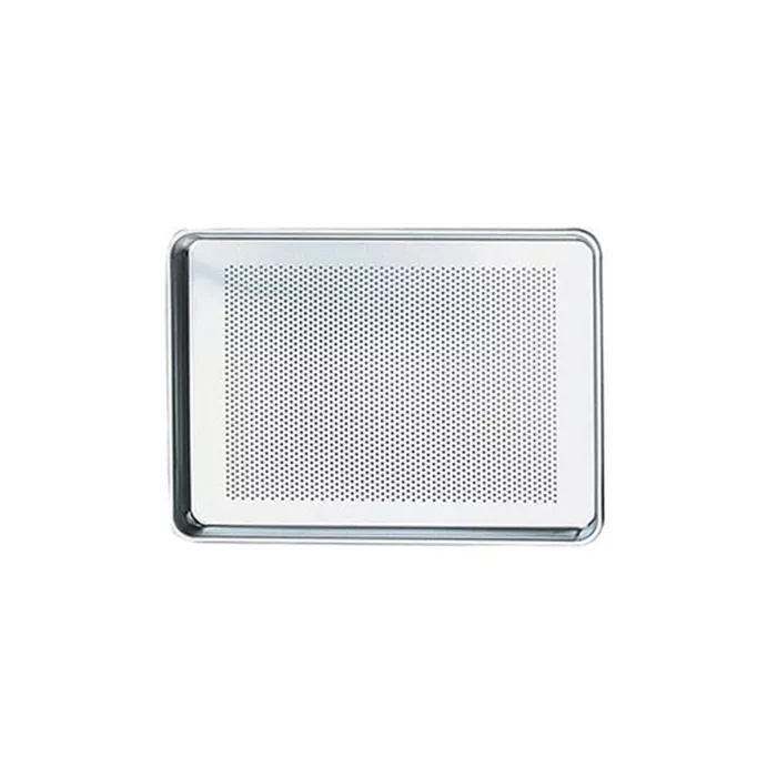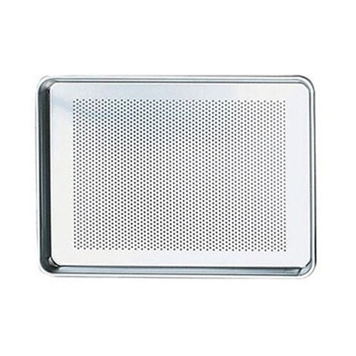 Impact-resistant 3000 series aluminum. Tapered design for easy stacking. Sized to fit standard baker's racks. Closed bead includes galvanized non-rusting rod for reinforcements. Concave bottoms flatten during heating for even heat distribution. Coated with non-stick coating for easy food release and cleaning. Perforated for oven broiling and baking.