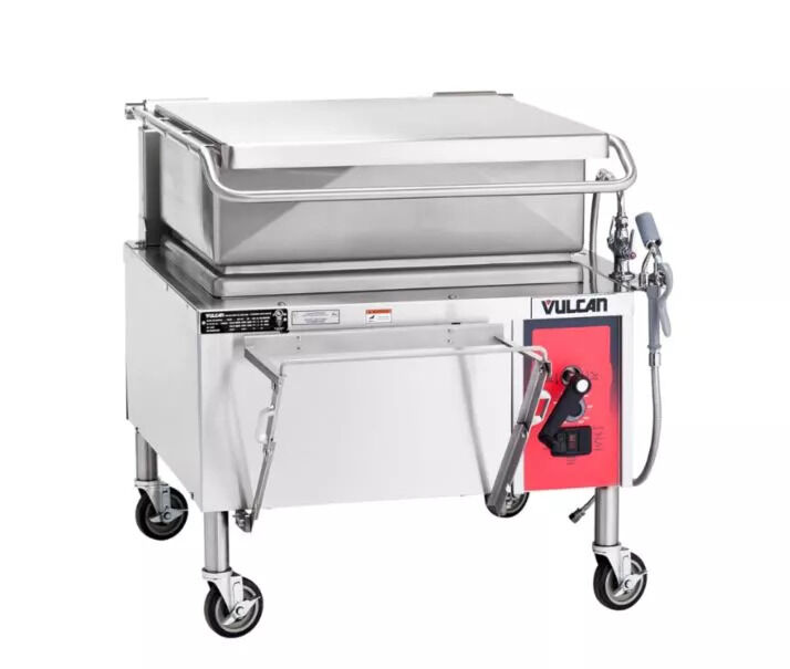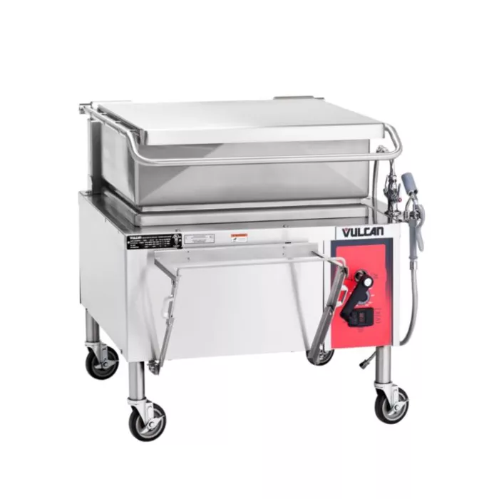 Manually operated anti-jam pan tilting mechanism with removable handle. Pan can be fully tilted to empty completely with approximately 30 crank revolutions.