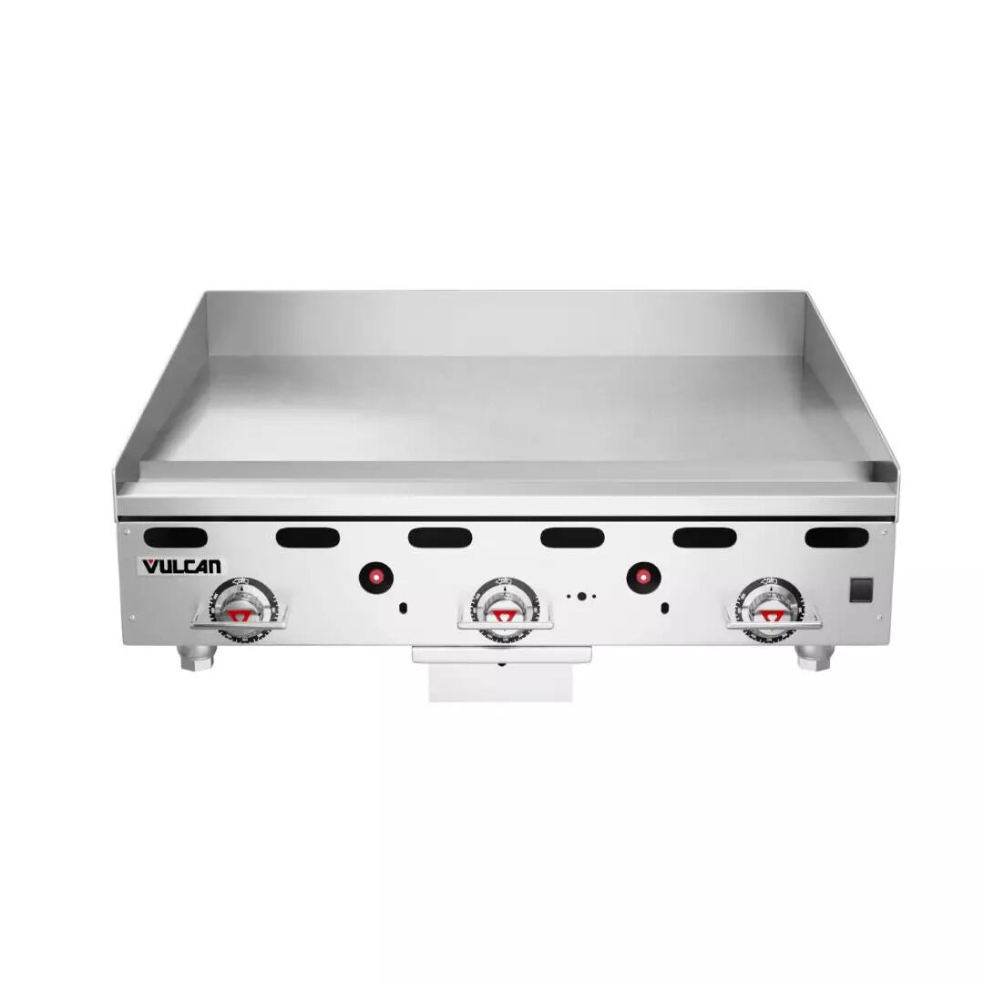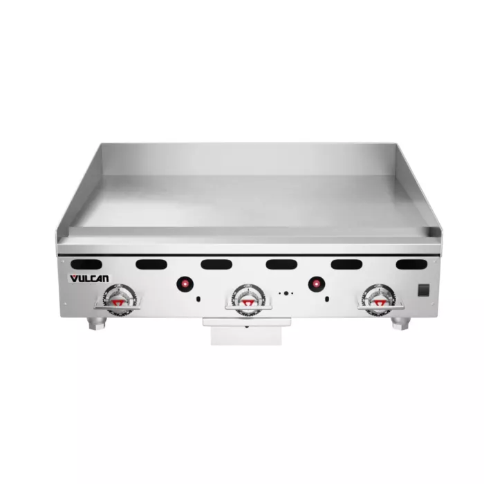 - 1" thick polished steel griddle plate with 12 gage, 4" stainless steel back and tapered side splashes
