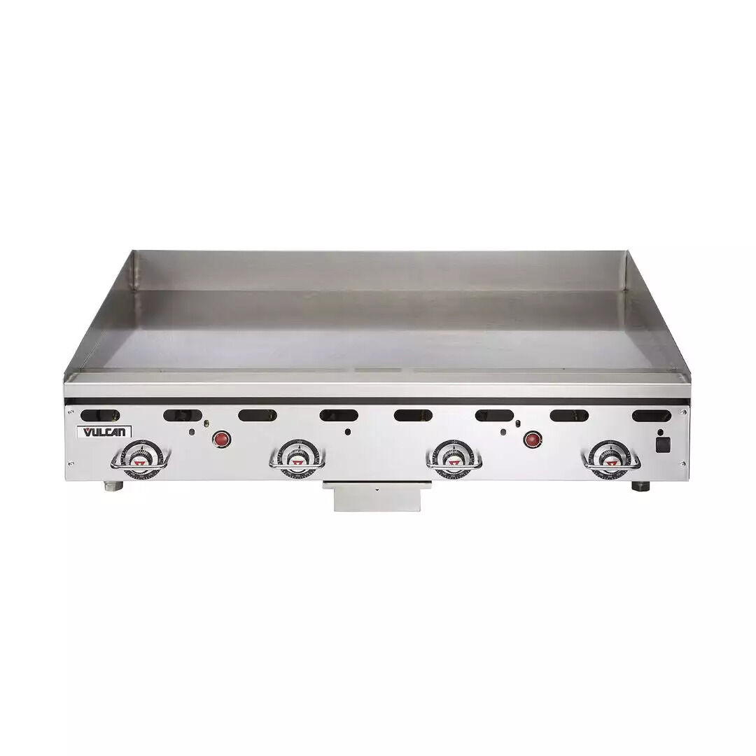 - 1" thick polished steel griddle plate with 12 gage, 4" stainless steel back and tapered side splashes