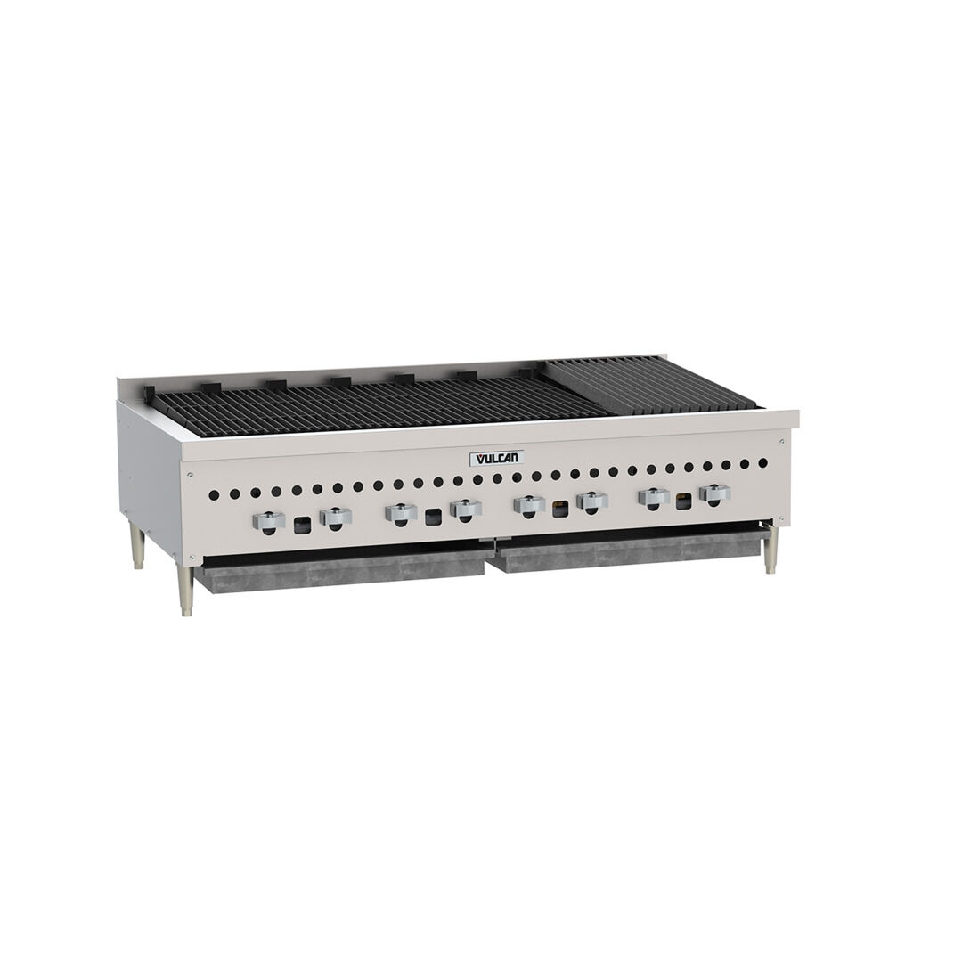 5.25" wide sloped cast iron grates are reversible for “level” broiling or self-cleaning. Cast in pitched grease trough in each grate blade provides fat run-off and controls flareups