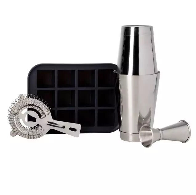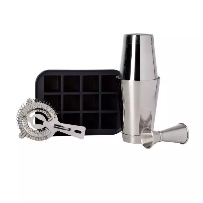 Kit components: jigger, hawthorne strainer, Cocktail Shaker, everyday ice cube tray.