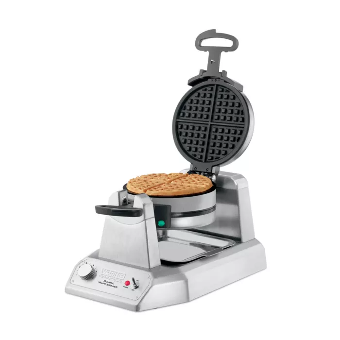 Take your breakfast service to the next level with the Waring® WWD200 Double Classic Waffle Maker. Its space-saving vertical design cooks two waffles at once so you can make up to 60 thick waffles per hour. Triple-coated nonstick surfaces, heavy-duty, die-cast housing, embedded heating elements and a rotary feature ensure even results and quick cleanup.