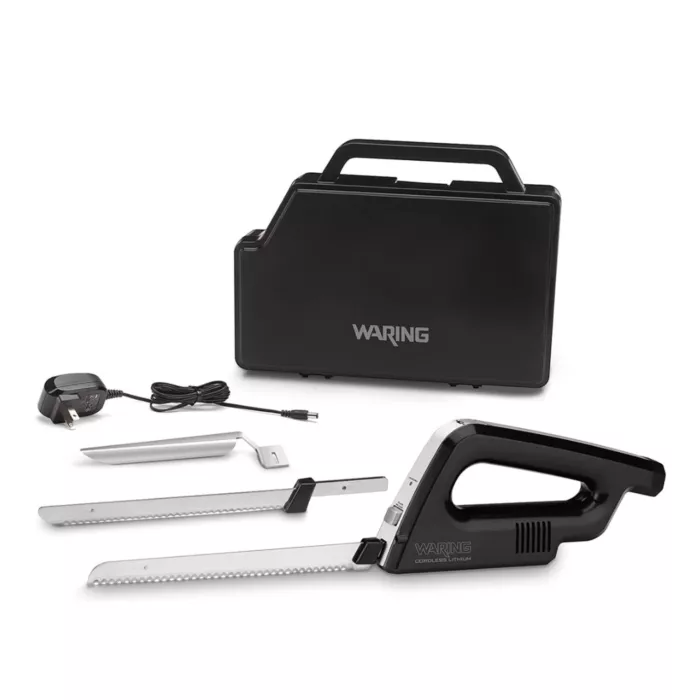 Carve out a more effective kitchen with the Waring® WEK200 Cordless Lithium Electric Knife. Its heavy-duty, brushless DC motor, separate bread and carving blades, and rechargeable lithium ion battery pack make quick work of any slicing task. Includes an integrated LED light for improved visibility in low-lit areas along with a heavy-duty carrying case that doubles for storage.