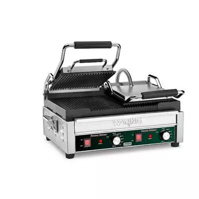 Make perfectly grilled panini sandwiches and more with the 240V Waring® WPG300 Double Italian-Style Panini Supremo Grill. Grooved cast-iron plates heat evenly and quickly cook sandwiches, burgers, chicken, and vegetables up to 3" thick. Its brushed stainless steel body and removable drip tray are easy to clean. Includes dual POWER and READY indicator lights.