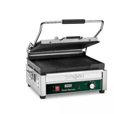 Make perfectly grilled panini sandwiches and more with the 208V Waring® WPG250B Large Italian-Style Panini Grill. Grooved cast-iron plates heat evenly and quickly cook sandwiches, burgers, chicken, and vegetables up to 3" thick. Its brushed stainless steel body and removable drip tray are easy to clean. Includes adjustable thermostat to 570°F along with POWER and READY indicator lights.