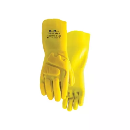- High-visibility yellow fully coated PVC with sandy finish provides chemical protection against formaldehyde (480 mins), sodium hydroxide 40% (>480 mins) and Sulfuric Acid (>75 mins)