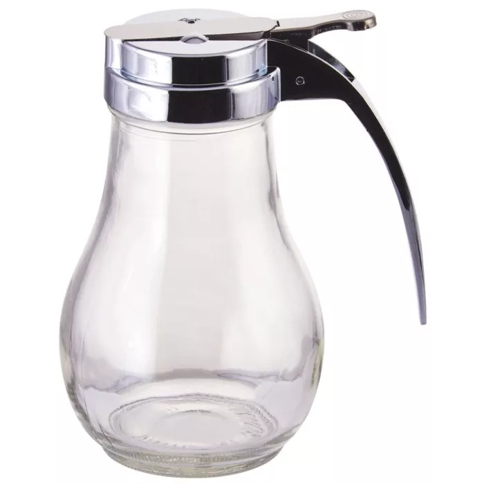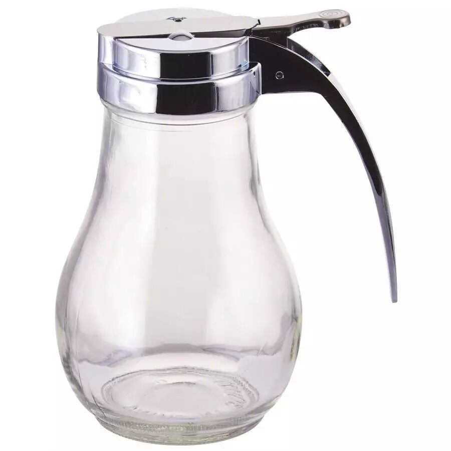 Syrup Dispenser, 14 Oz. Stainless steel top. Glass Bottle.