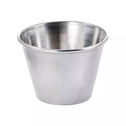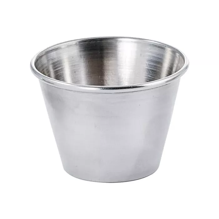 This stainless steel sauce cup is the perfect way to transport sauces from kitchen to table.