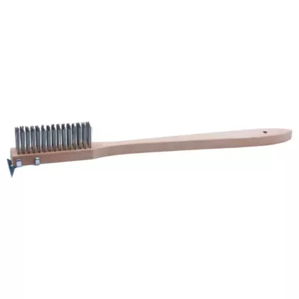 This heavy-duty wire brush (complete with scraper and wooden handle) is the perfect solution to cleaning smallware.(Scraper) Bristles (rows): 15 X 5