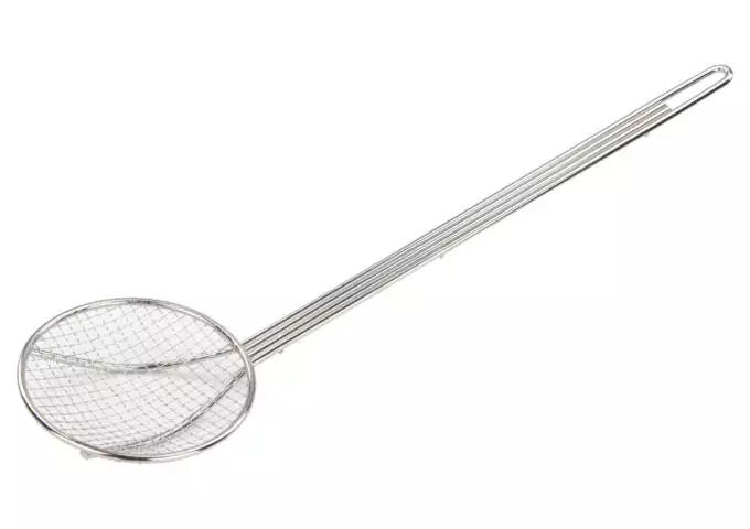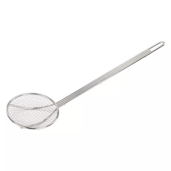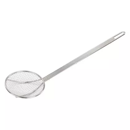 Round skimmer with coarse mesh and nickel plated steel wire.