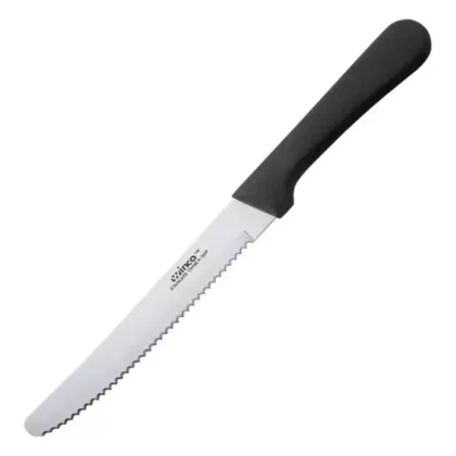 With its sharp serrated edge and pointed tip, theAcero knife is designed to make simple work of cuttingthrough steaks and chops. A stainless steel end capprovides excellent balance and control. This heavyweightknife is a Winco exclusive and is a must-have onthe tables of any steak house.