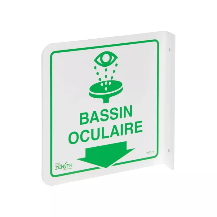 - Pictogram and directional arrow indicate the location of the emergency eye wash