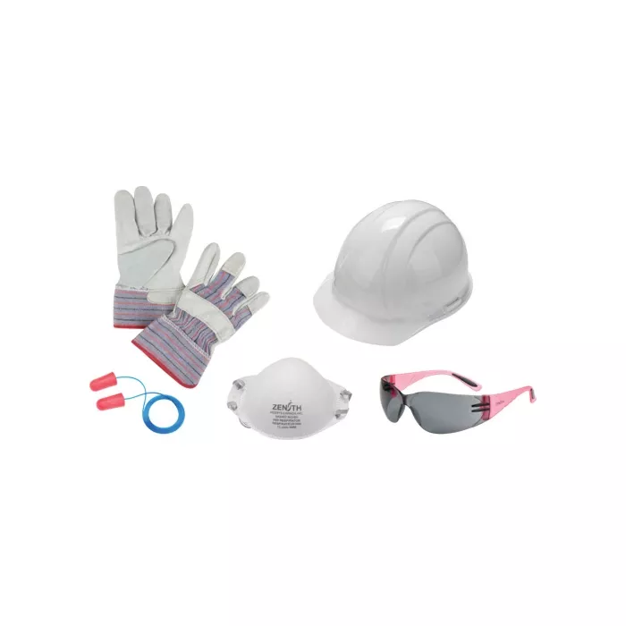- Includes: Hard hat, safety glasses, work gloves, ear plugs, respirator
