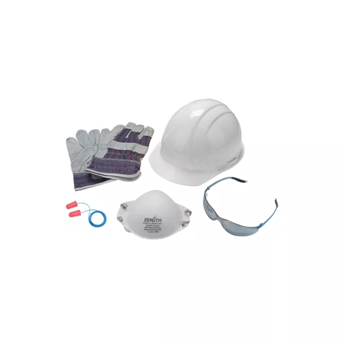- Includes: White hard hat, safety glasses, work gloves, ear plugs, respirator
