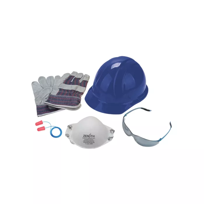 - Includes: Blue hard hat, safety glasses, work gloves, ear plugs, respirator