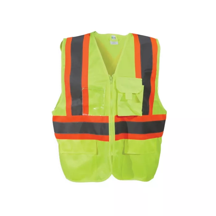 - This 100% polyester vest with zipper front has 2 bottom pockets, a breast pocket and a clear ID pocket