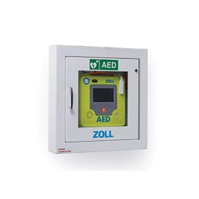 Keep your ZOLL AED 3 defibrillator secure and easily accessible for medical emergencies with a battery-operated, alarmed wall cabinet. It holds a ZOLL AED 3, plus a backup set of electrodes and a backup battery should you need them. Semi-recessed for less intrusive storage. Includes alarm, AED label set, and installation instructions.