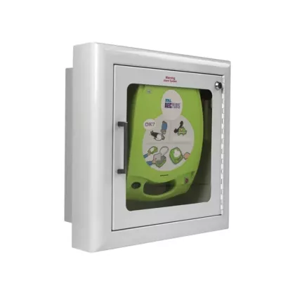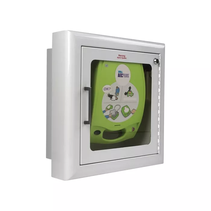 - This 7" deep alarmed wall cabinet holds the AED Plus® device (without a carrying case) and one spare set of electrodes