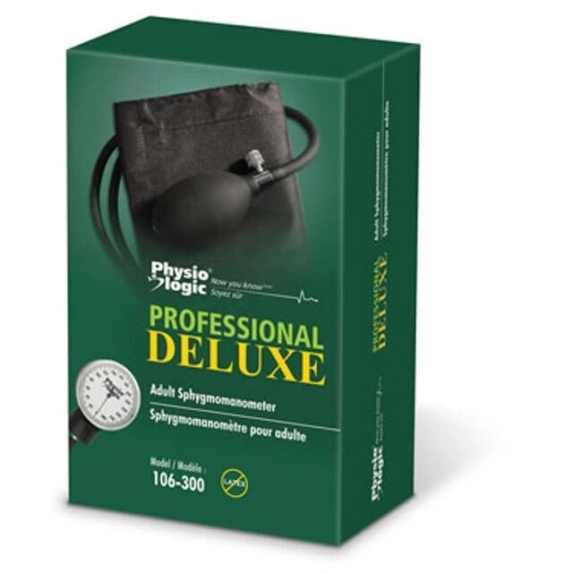 This aneroid features a no-stop pin 300 mm Hg gauge, quality polyvinyl chloride (PVC) inflation system and calibrated nylon thigh velcro cuff. Comes complete with a vinyl zippered case and instructions. • Latex-FreeVue d’ensemble