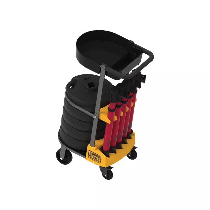 • Chariot mobile facilitant le déploiement du système de barricades tout en minimisant l'espace de rangement
