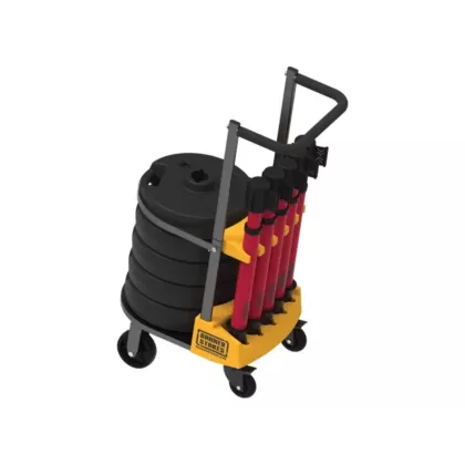 - Comprend: (1) chariot, (5) montants PLUS, (5) rubans rétractables PLUS, (5) bases PLUS