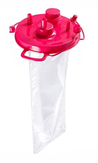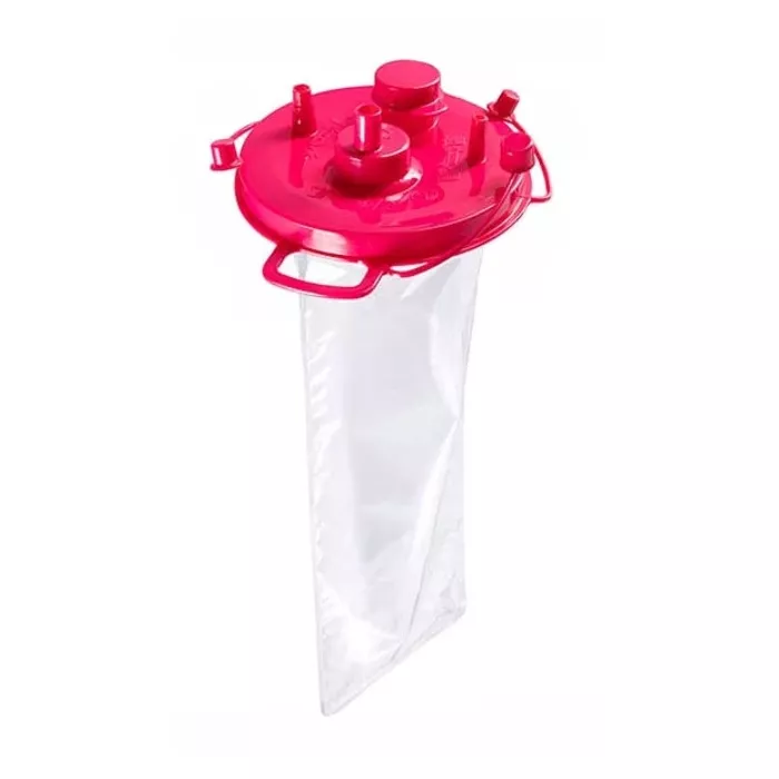 with attached pink lid, Aerostat® filter, float valve shutoff, anti-reflux valve, one elbow Bottom Diameter: 3 3/4" Top Diameter: 6 1/8" Height: 15 3/4" 50 liners/case.Vue d’ensemble