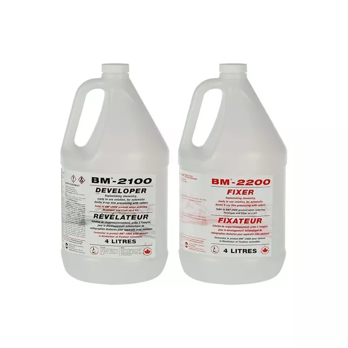 Packaged 2 x 4 L of Developer (BM-2100) and 2 x 4 L of Fixer (BM-2200) per case.