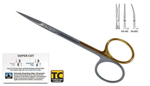 Iris Super Cut Scissors StraightLength: 110mmMaterial: Tungsten Carbide InsertsSuper Cut Scissors have specially designed cutting edges.Unique design features allow extremely smooth cutting of fine and coarse tissue with reduced trauma.Cutting blade honed to "razor" sharpness with opposing blade finished with fine serrations to avoid tissue slippage.