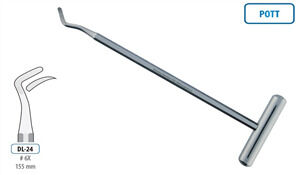 Root Elevator Pott RightLength: 150mmMaterial: Martensitic Stainless SteelUsed to loosen the tooth from the periodontal ligament and ease extraction.