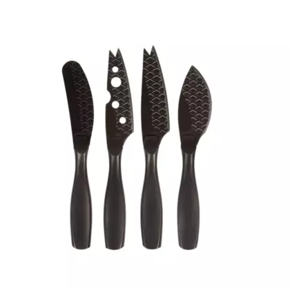 This handy knife set contains four compact cheese knives. Each knife is suitable for a specific type of cheese. Use the spreading knife for fresh cheeses and the knife with the holes in the blade for soft to semi-hard cheeses. Pick up pieces of semi-hard cheese using the tines on the knife with the forked tip, and use the Parmesan knife to break apart hard cheeses.