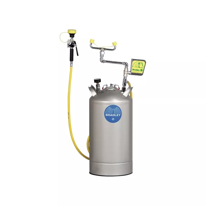 - La douche oculaire est actionnée par une grande poignée en acier inoxydable à pousser et d'une valve à bille qui reste ouverte