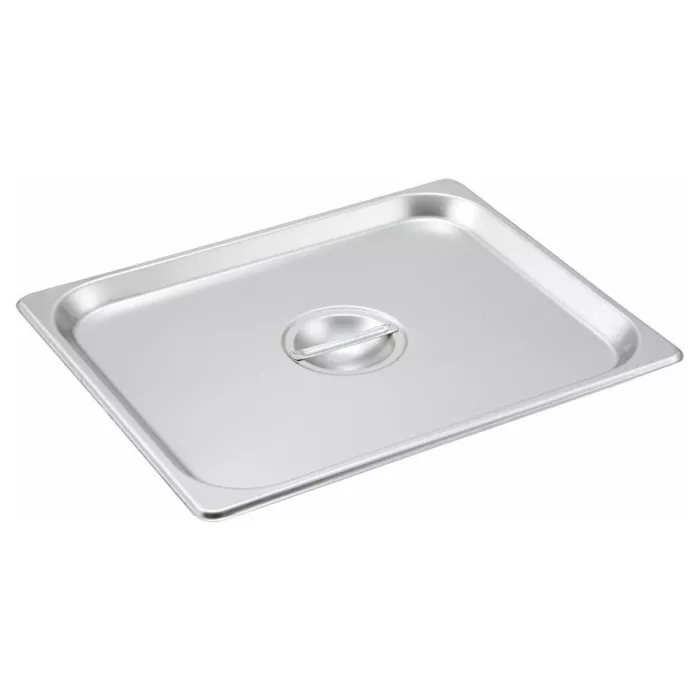 The Browne Half Size Steam Pan Solid Cover has a sturdy center flat handle that’s easy to lift. It keeps food hot or cold and prevents contamination. The bright finish offers elegant presentation.