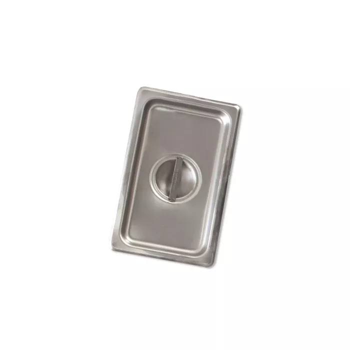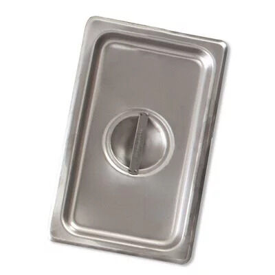 The Browne One Third Size Steam Pan Solid Cover has a sturdy center flat handle that’s easy to lift. It keeps food hot or cold and prevents contamination. The bright finish offers elegant presentation.
