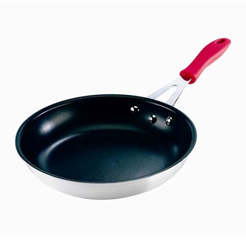Riveted steel handle with removable red silicone heat resistant sleeve (to 410°F)