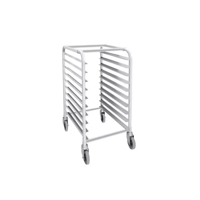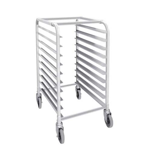 Holds 10 full-size sheet pans respectively. Made of aluminum for lasting durability. Has rail-type ledges to support pans. Complete with four casters for easy transportation. Units shipped unassembled.