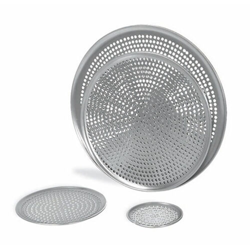 Perforated aluminum pizza tray. 1.0 mm 0.040 thickness. Pizza bottom cooks faster and makes crispier crust.