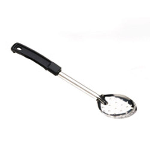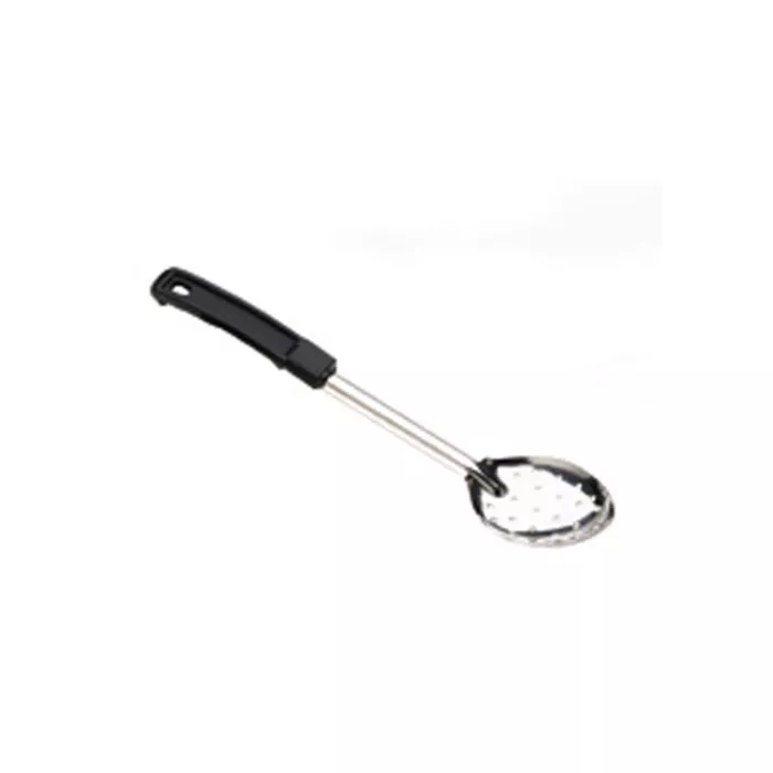 Stainless steel. Black polypropylene handles, with a hanging hole. Grooved handle for added durability. 1.5 mm thickness.