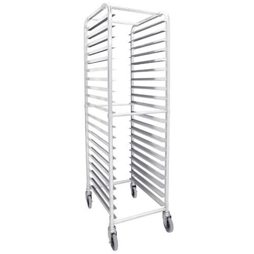 Holds 20 full-size sheet pans.  Made of aluminum for lasting durability. Has rail-type ledges to support pans.