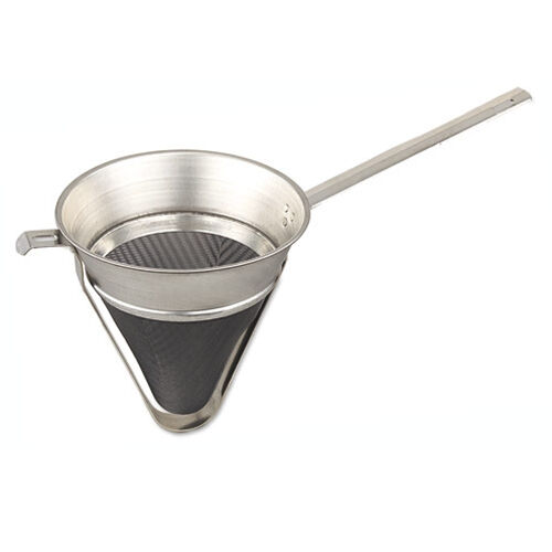 Tin-plated with extra-fine mesh. Pan hook provides stability while straining liquids.