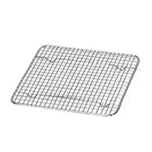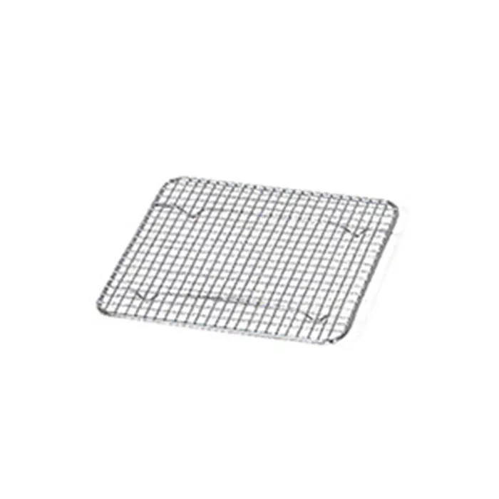 Nickel-plated wire mesh grate keeps food from sticking to pan. Raised grate allows cooked food to drain.